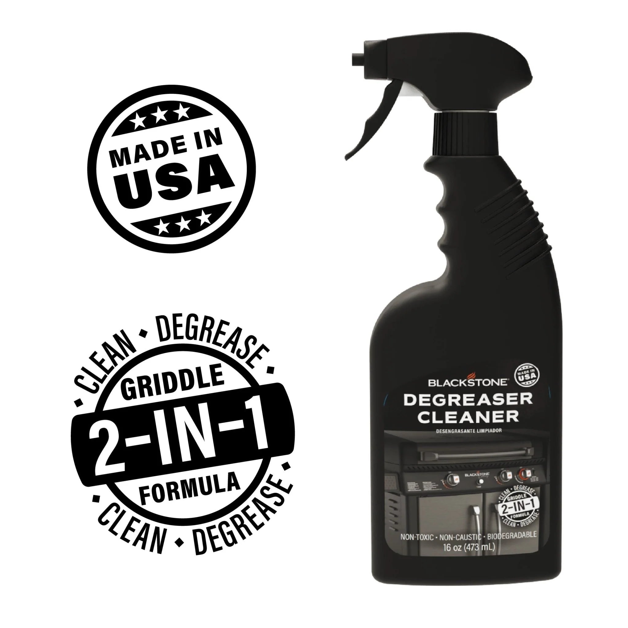 Blackstone's 2-in-1 Griddle Degreaser Spray is gentle enough to clean every surface of your griddle while cutting through the grease. This spray will not corrode or burn your griddle top. That means whatever you cook, and where ever you cook, you can have a clean griddle to start. Blackstone griddles should be cleaned, seasoned, and stored after each use. This new degreaser cleaner makes that process simpler since it is safe to use on the entire griddle. Simply spray and wipe the grease away.