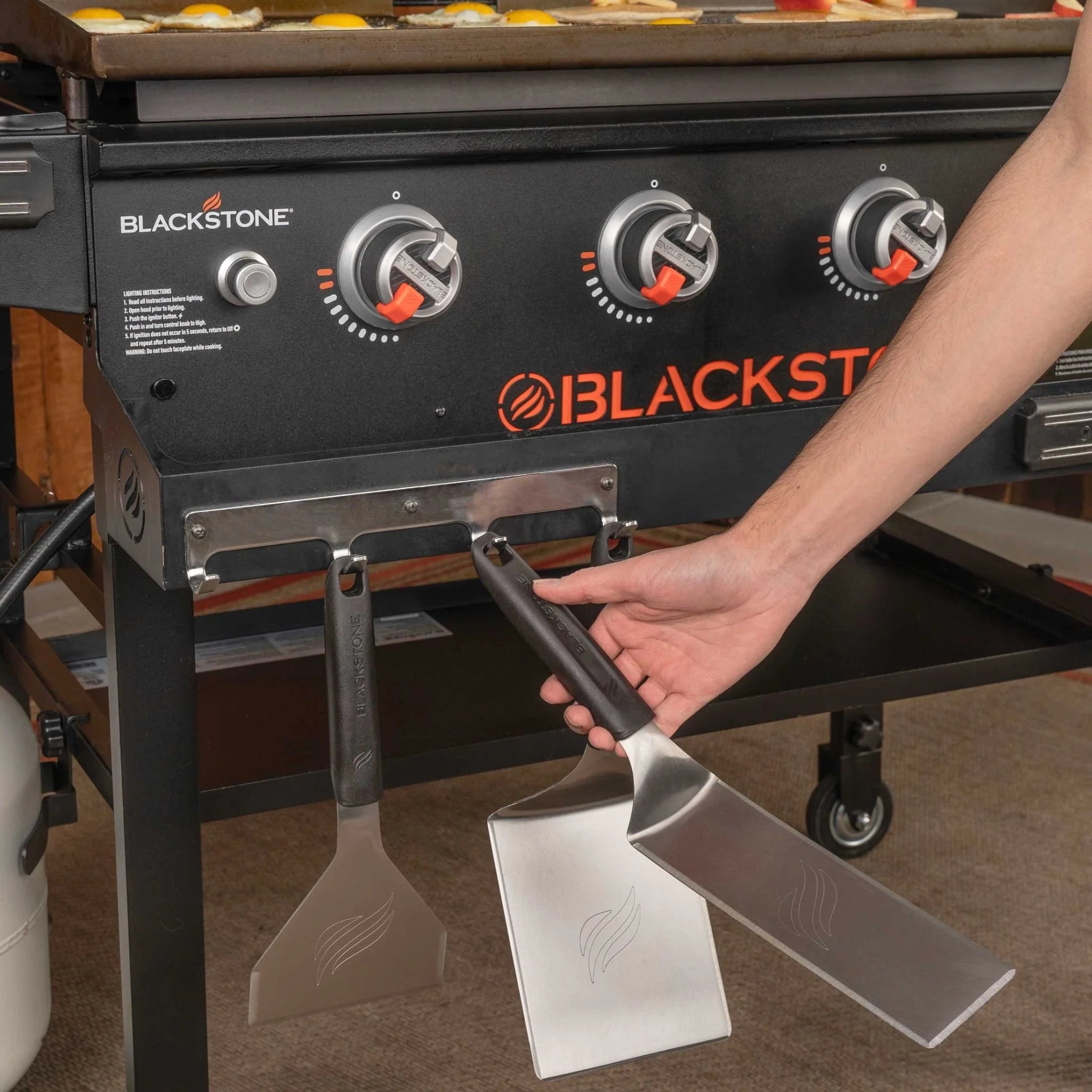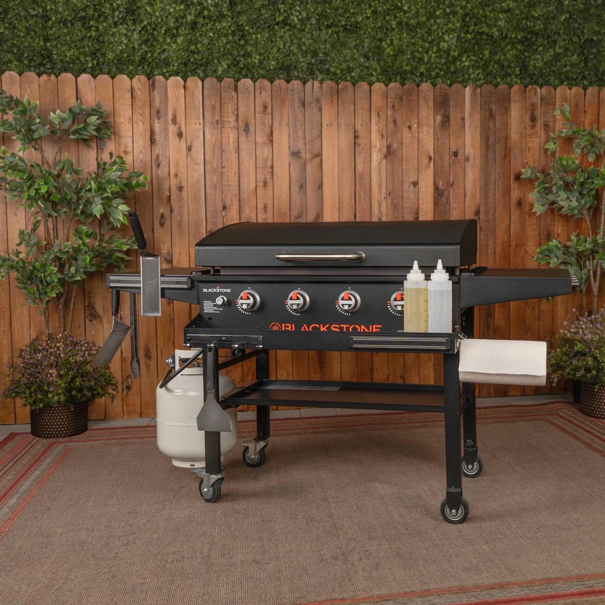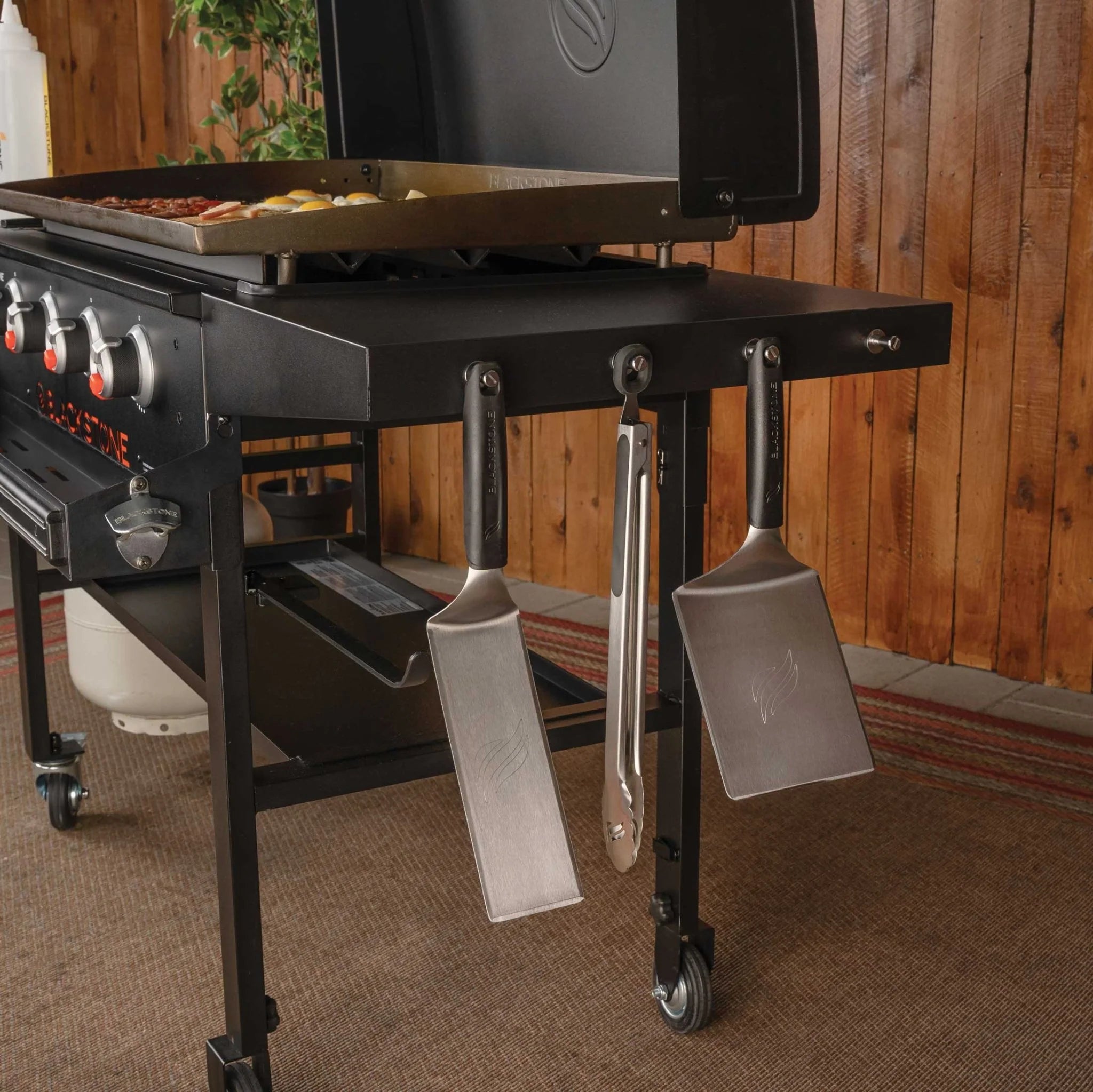 The Blackstone Original 36” Griddle with Hood Bundle delivers everything you need for versatile outdoor cooking. Four independently controlled heat zones let you cook a variety of dishes at once, while the front accessory tray, magnetic toolbar, and hooks keep tools organized and within reach. Dual folding side shelves add prep space and fold down for compact storage, and a built-in paper towel holder keeps cleanup essentials close by. With the included soft cover to protect your griddle, you’ll have everything you need to cook up delicious breakfast, lunch, and dinner!